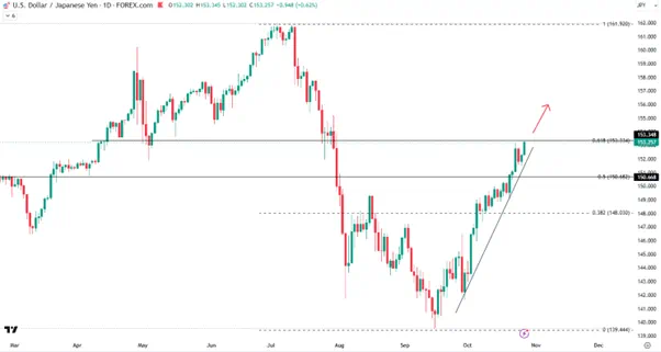 美日10年期国债利差已经重回3.3%上方,这带动美/日突破153关口。从基本面来看,不论是美国大选或强势美元,还是日本央行暂停加息或国会选举,短期内都无法对汇价构成利好。