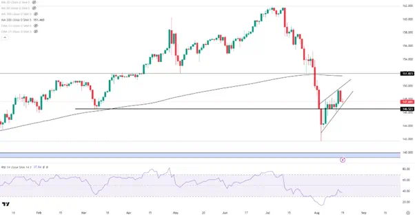下行方向,首先需要关注146.50一线的重要支撑,失守后恐下探至142甚至140附近。若在通道内部延续反弹, 151.80成为了上方的首要阻力,这里也是200天均线所在的位置。