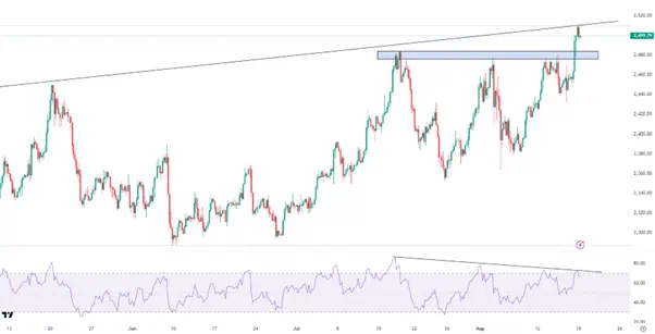 市场预期鲍威尔或在本周五的讲话中传递出迄今为止最为明确的降息信号。但温和的降息措辞(25bp)只是符合市场的预期而已,很难给市场带来额外的利好。而一旦出现降息50bp的暗示,美元指数或延续弱势,而黄金和美股有望继续冲高。